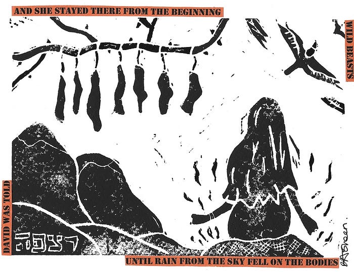 Rizpah spreads out the sackcloth, as her first act. Like so many women before her and after her, she takes the task of mourning and remembering upon herself. Like the wailing women in Jeremiah, she grieves, and ensures the sound of wailing is heard: