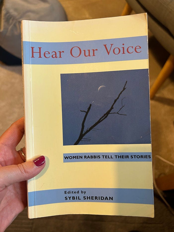 The second guest of honour was Rabbi Elli Sarah (Emeritus Rabbi of Brighton & Hove Progressive Synagogue, (https://rabbiellisarah.com). Elli, like Tony, were friends of my mum. I was in awe. At the young age of 11 I had decided to become a rabbi. And, in my synagogue, at my Bat Mitzvah was the Rabbi Elli Sarah. She was wise, powerful, learned and a truth-teller. Elli too handed me a present. It was the book, Hear Our Voice: Women Rabbis Tell Their Stories, edited by Rabbi Sybil Sheridan. Alongside the perfume, this book has travelled everywhere with me.